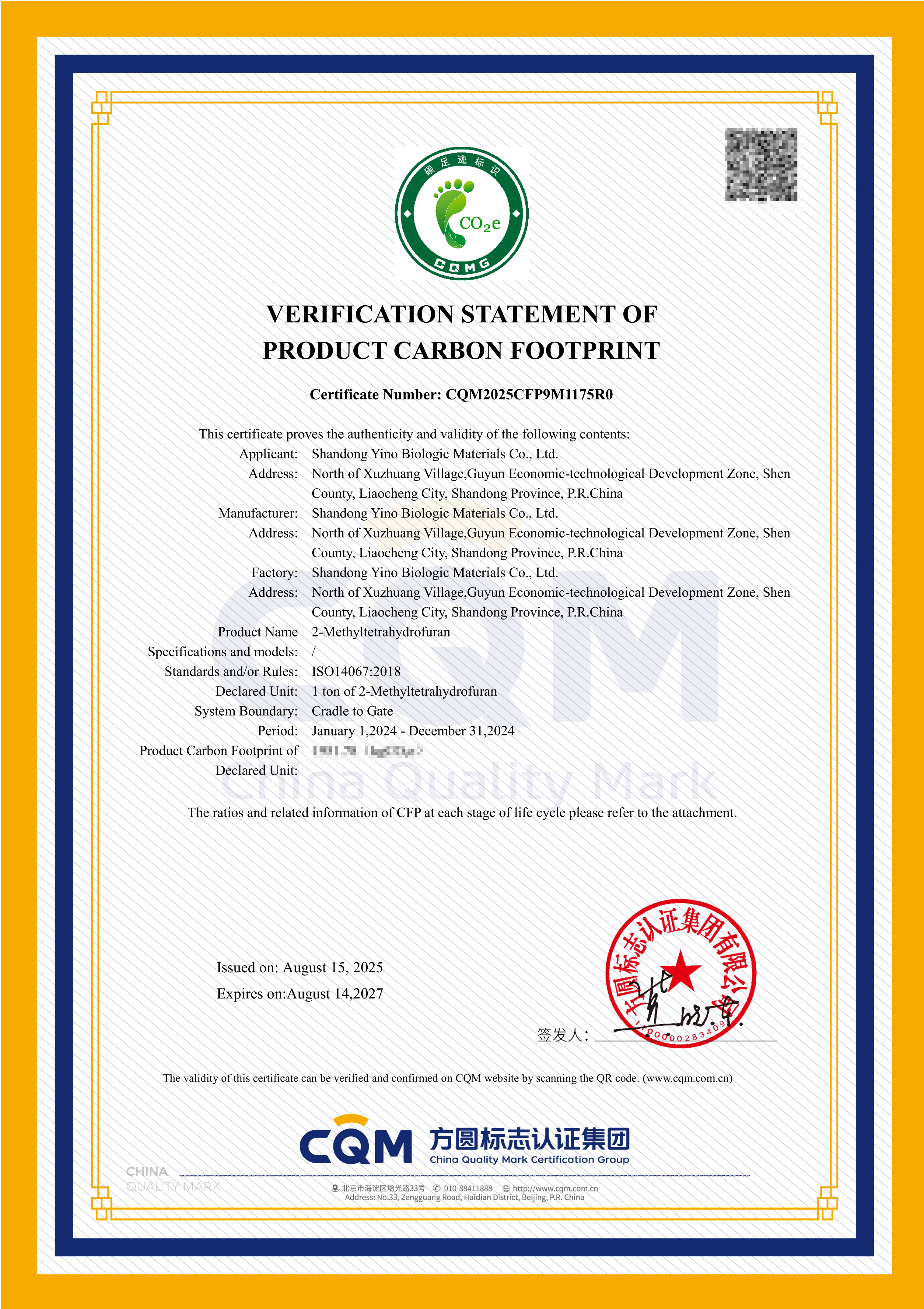 The certified product is 2-Methyltetrahydrofuran (2-MeTHF), a green, bio-based solvent produced from corncob biomass. By replacing fossil-based feedstocks, this product significantly reduces emissions at the source and provides customers with a sustainable alternative for pharmaceutical synthesis, agrochemical formulations, and polymer production. Known for its strong solvency, high chemical stability, and low environmental risk, 2-MeTHF plays an increasingly vital role in enabling sustainable transformation across the chemical and pharmaceutical industries. With the new PCF certification, YINO Biologic makes its production process transparent, measurable, and traceable, providing partners with reliable assurance of low-carbon responsibility.