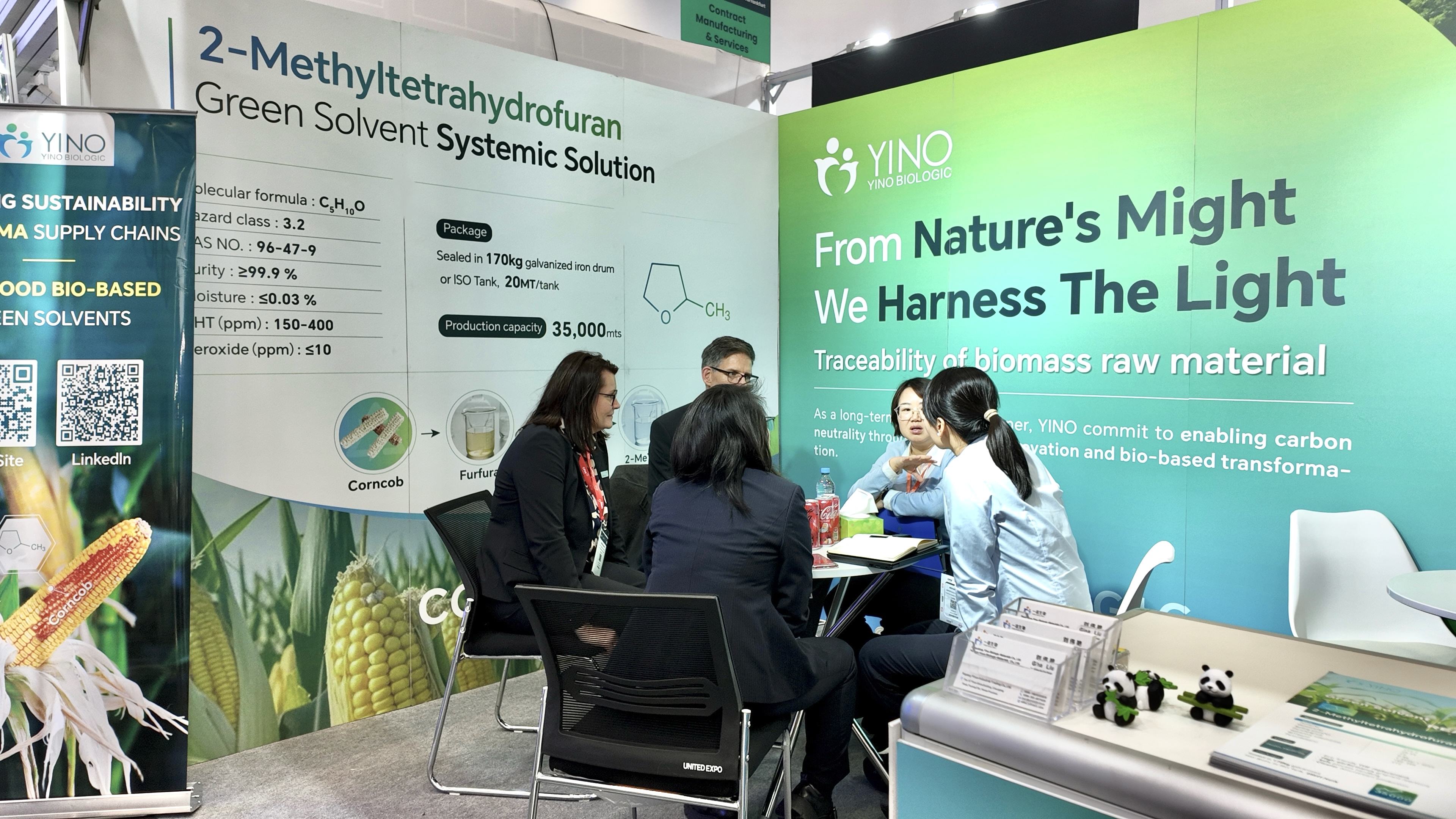 在制藥生產(chǎn)中,溶劑與原料的選擇不僅關(guān)系到工藝的安全性與環(huán)境友好性,更直接影響藥物純度和生產(chǎn)效率。YINO Biologic 以非糧生物質(zhì)玉米芯為原料,從源頭實(shí)現(xiàn)碳減排與資源高效利用,構(gòu)建了覆蓋從原料到終端制造的綠色供應(yīng)鏈。本次展會(huì)上,公司重點(diǎn)展示了多款高性能可持續(xù)產(chǎn)品,包括可作為活性藥物成分(API)合成綠色溶劑的 2-Methyltetrahydrofuran(2-MeTHF),該產(chǎn)品可有效替代傳統(tǒng) THF,顯著降低揮發(fā)性有機(jī)物排放并提升反應(yīng)安全性與效率;用于高端藥物保護(hù)基及精細(xì)化工中間體合成的關(guān)鍵原料 3,4-Dihydro-2H-Pyran(DHP);以及新一代高純度環(huán)狀酯原料 δ-Valerolactone(δ-VL),廣泛應(yīng)用于藥物輔料及聚合物開(kāi)發(fā)領(lǐng)域,充分展現(xiàn)了 YINO 在綠色化學(xué)與可持續(xù)材料創(chuàng)新方面的實(shí)力。
